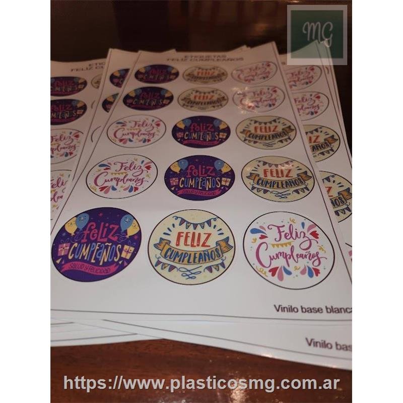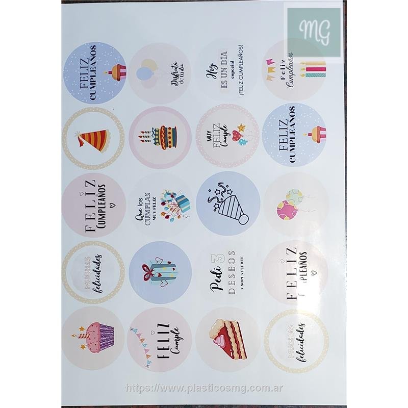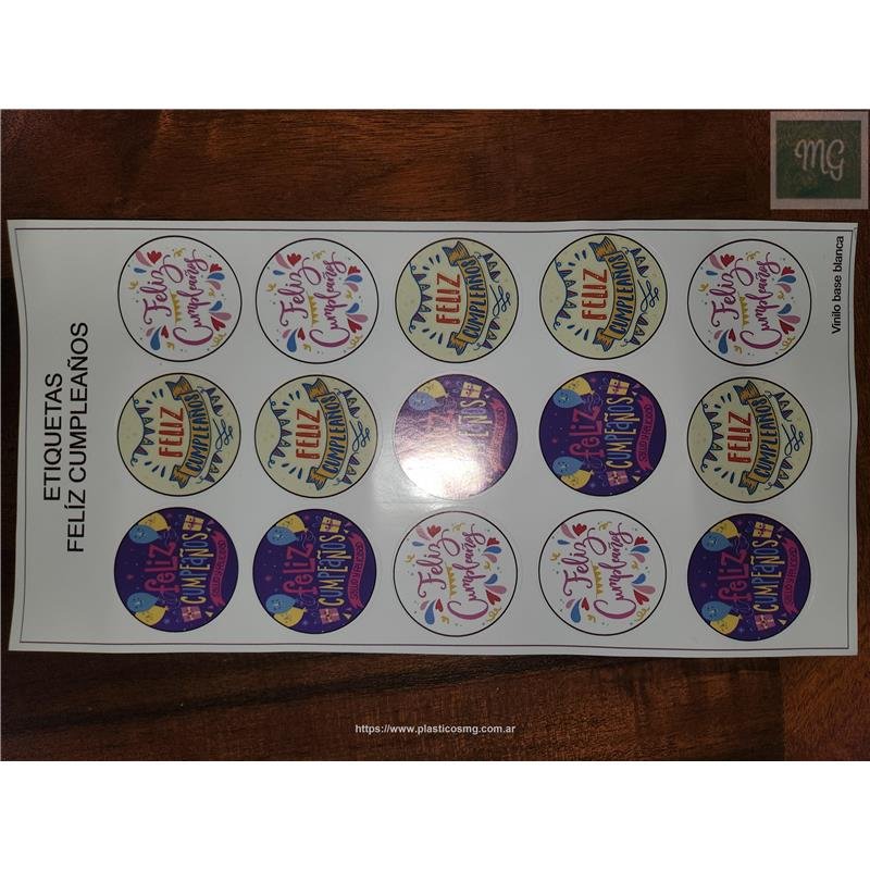 Vinilo autoadhesivo motivo Feliz Cumpleaños sobre base blanca. Plancha de 20 etiquetas autoadhesivas para recortar.